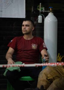 El panorama es desolador, cilindros vacíos, bomberos “estoicos” acostados en el piso, cubiertos de hollín, polvo y esquirlas de vidrio, máscaras de oxígeno en las manos, cualquier lugar sirve para recuperar fuerzas ante el cansancio que hace temblar las piernas, sucumbir al peso de los equipos luego de 10 o 12 de titánica labor no es tarea fácil.
