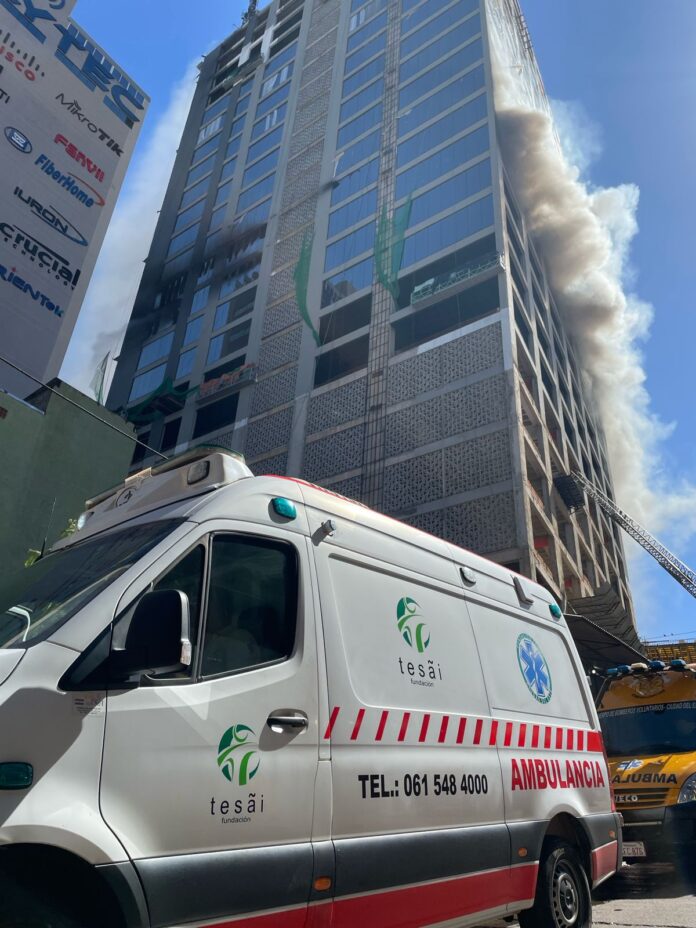 Ambulancias de la Fundación Tesãi trabajan arduamente con los bomberos de la Itaipú Binacional y Bomberos Voluntarios como soporte y asistencia a las tareas de sofocamiento de las llamas de un edificio en construcción en el microcentro de Ciudad del Este.