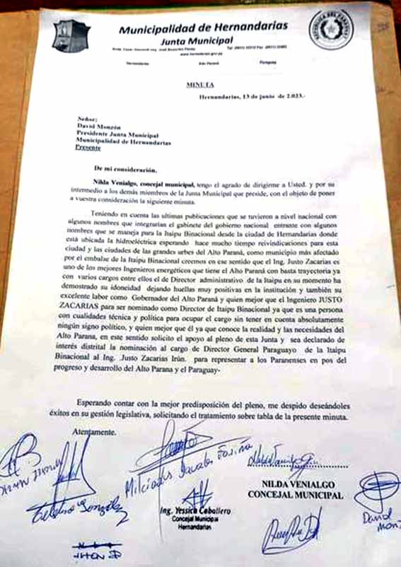 La minuta fue presentada por la concejal Nilda Venialgo y fue acompañada por Jhon Florentín, Yessica Caballero, Milcíades Dávalos, David Monzón, entre otros ediles, solicitando al pleno de la Junta declarar de “interés municipal” la posible designación de Lucho Zacarías para el máximo cargo dentro de la binacional, “teniendo en cuenta su vasta trayectoria en cargos como el de director administrativo en la Entidad, en su momento y su excelente gestión como gobernador del Alto Paraná”, menciona parte de las consideraciones de la referida minuta.