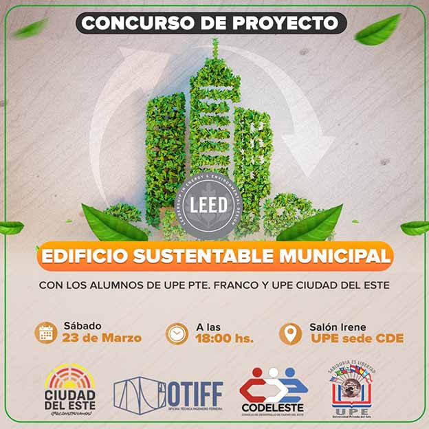 Estudiantes destacados de la carrera de Arquitectura y Urbanismo de la Universidad Privada del Este (UPE) de las sedes de Presidente Franco y Ciudad del Este presentarán sus proyectos de edificios sustentables municipales en un evento abierto al público el próximo sábado 23 de marzo, a las 18:00 horas, en el salón Irene de la filial CDE.