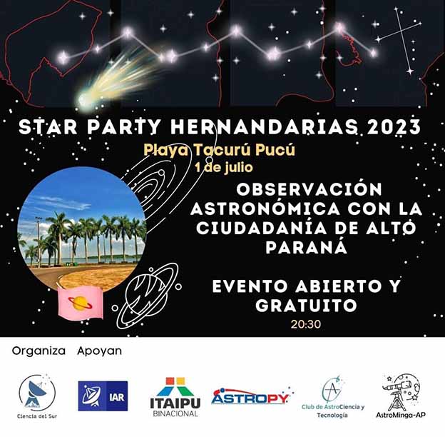 La Playa Tacurú Pucú, dependiente de Itaipú, albergará desde hoy, viernes 30 de junio, la “Star Party Hernandarias 2023”, un campamento astronómico que forma parte del II Festival Internacional de la Ciencia del Paraguay. El evento, patrocinado por la Binacional, se desarrollará hasta el domingo 2 de julio. Para el sábado, a partir de las 20:30, está prevista una observación astronómica en el lugar, abierta y gratuita para toda la ciudadanía.