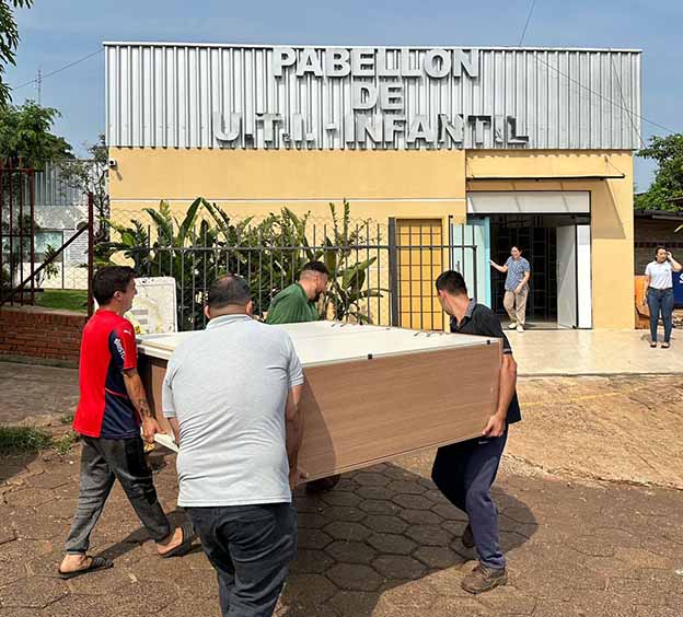 Por mandato el Gobierno Nacional y la Itaipú Binacional, la Fundación Tesãi procedió a la donación de un importante lote de mobiliarios al nuevo Pabellón de UTI-Infantil del Hospital Regional de Ciudad del Este. Acompañaron el acto de entrega el Dr. Carlos Torras, gerente Financiero de Tesãi, el Dr. Federico Schrodel, director del nosocomio público y funcionarios del Departamento de Patrimonio del Hospital del Área 2.