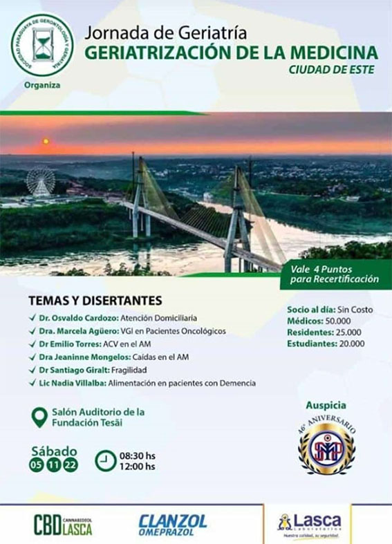 Anuncian que existen cupos limitados y los precios para los socios al día es sin costo, médicos 50.000 guaraníes, residentes 25.000 guaraníes y estudiantes 20.000 guaraníes. “Vamos a hablar de los cuidados de un paciente encamado, nutrición de un adulto mayor con demencia, el paciente frágil, el significado de una caída que puede traducir una patología oculta, ACV en adultos mayores y otros temas”, explicó la doctora Marcela Agüero, especialista en geriatría y principal coordinadora.
