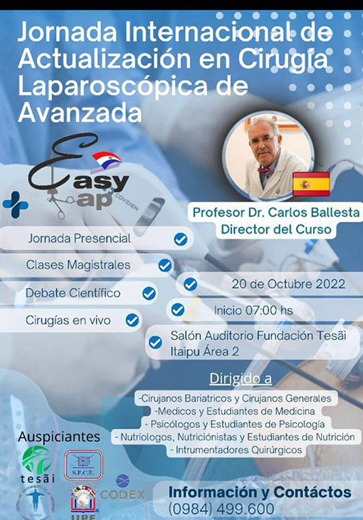 La Fundación Tesãi prepara la “Jornada Internacional de Actualización en Cirugía Laparoscópica de Avanzada” con transmisión de cirugías en vivo a desarrollarse el día 20 de octubre en el Salón Auditorio del Hospital del Área 2 de Ciudad del Este. Durante la misma, pacientes sociales serán sometidos a nuevas técnicas de cirugía bariátrica con “costo cero”, de la mano de cirujanos paraguayos y el Dr. Carlos Ballesta, referente mundial de Barcelona, España, considerado uno de los padres en la especialidad de cirugía laparoscópica y cirugía de obesidad.
