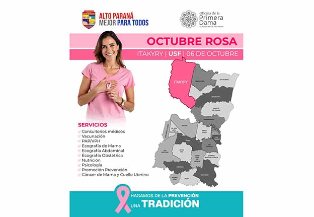 La Gobernación de Alto Paraná extiende su compromiso con la salud femenina y anuncia una importante jornada de prevención como parte de la campaña departamental «Octubre Rosa». La cita es para toda la comunidad de Itakyry y se llevará a cabo este lunes 6 de octubre.