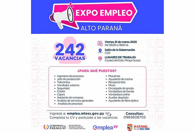 La Gobernación del Alto Paraná, por medio de su Secretaría de Industria, organiza para este viernes 21 una Expo Empleo que ofrecerá 242 oportunidades laborales para los ciudadanos de Alto Paraná.
