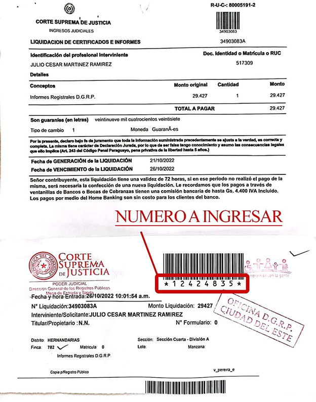 A continuación explica: “Para todos los que estén interesados en indagar la originalidad las documentaciones que presento en esta publicación les dejo el link de Dirección General de Registros Públicos, en donde pueden ingresar la numeración que se encuentra bajo el código de barra o pueden acercarse a la Dirección Jurídica de la Municipalidad y solicitar una copia”.