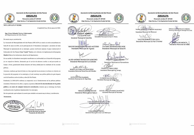 La Asociación de Municipalidades del Alto Paraná (AMUALPA) expresó su respaldo institucional al Gobernador del Alto Paraná, Ing. César “Landy” Torres, en relación a la implementación del programa Hambre Cero en las instituciones educativas del departamento.