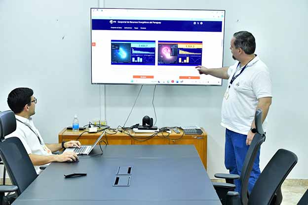 Con el fin de avanzar en la creación de un Geoportal de Energías Renovables (GER), equipos técnicos de la Asesoría de Energías Renovables de Itaipú y de la Fundación Parque Tecnológico Itaipú–Paraguay (FPTI-PY) mantuvieron una reunión de trabajo para acompañar el avance del proyecto. El encuentro, que se desarrolló en la Central Hidroeléctrica (Hernandarias), contó con la participación del asesor de Energías Renovables de la Binacional, Pedro Domaniczky; y de la directora técnica de la FPTI-PY, Carolina Villasanti.