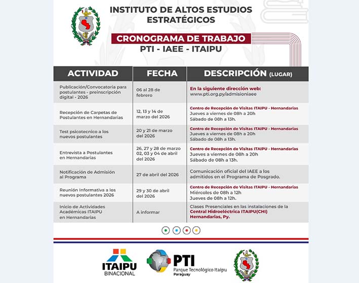 Itaipú, a través de su Universidad Corporativa (UCI), en colaboración con la Fundación Parque Tecnológico Itaipú (FPTI) y el Instituto de Altos Estudios Estratégicos (IAEE), anuncia la apertura del periodo de preinscripción 2026 en Alto Paraná para cursar tres programas de posgrado en las instalaciones de la central hidroeléctrica.