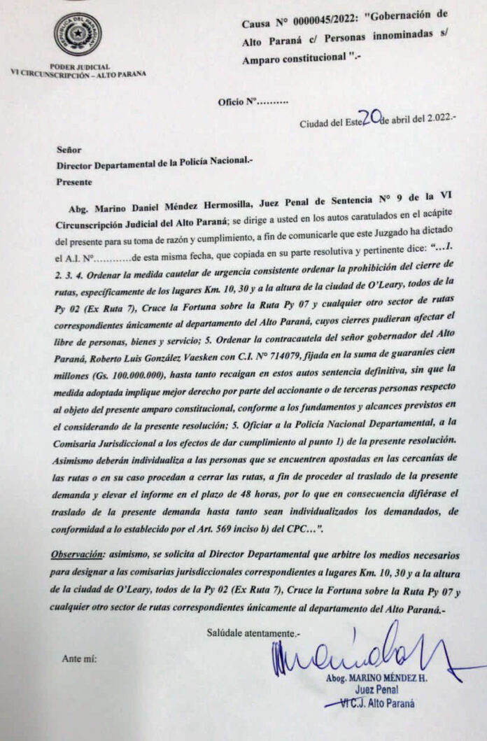 El juez Marino Daniel Méndez Hermosilla dispuso que no se pueden realizar cierres de rutas en el Alto Paraná mediante un amparo promovido por el propio gobernador, Roberto González Vaesken (ANR-cartista). La medida prohíbe cierres en los principales puntos del departamento como ser la rotonda del Km 10 de Ciudad del Este, del Km 30 de Minga Guazú, O´leary y La Fortuna.