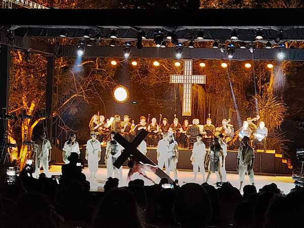 El público se emocionó con la magistral presentación artística inspirada en el libro en guaraní “Vía Crucis”, del sacerdote jesuita Alberto Luna. La propuesta integró danza, música y literatura en torno a una de las tradiciones más representativas de la devoción cristiana en Semana Santa. Más de 50 artistas participaron en escena; la interpretación estuvo a cargo del Ballet Clásico y Moderno Municipal de Asunción (BCCM), dependiente de la Dirección de Cultura y Turismo de la Municipalidad de Asunción, bajo la coreografía de Miguel Bonnin. La escenografía, iluminación y el sonido fueron especialmente diseñados para acompañar la narrativa durante toda la función.
