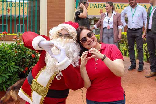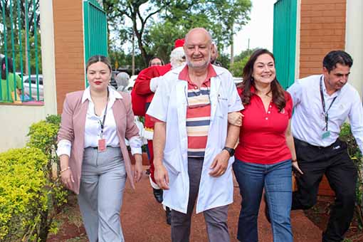 La actividad fue encabezada por la diputada nacional Rocío Abed de Zacarías, esposa del director general paraguayo de Itaipú, Ing. Justo Zacarías, quien estuvo acompañada de “Papá Noel”, recorriendo salas, pasillos y áreas sensibles del Hospital para compartir saludos y deseos de una feliz Nochebuena con pacientes, familiares, directivos, médicos, enfermeras y funcionarios.