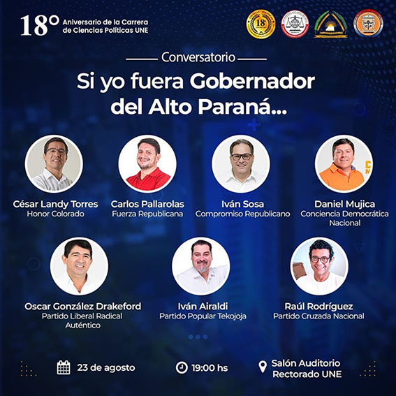 Los estudiantes de la carrera de Ciencias Políticas de la Facultad de Derecho y Ciencias Sociales de la Universidad Nacional del Este (UNE) organizan un conversatorio denominado “Si yo fuera gobernador del Alto Paraná”. Los invitados a disertar son los candidatos a ejercer el cargo del ejecutivo departamental. El evento se realiza en el marco de la conmemoración del 18º aniversario de la carrera de Ciencias Políticas. Será el próximo martes 23 de agosto, a las 19:00 horas, en el salón auditorio del Rectorado de la UNE.