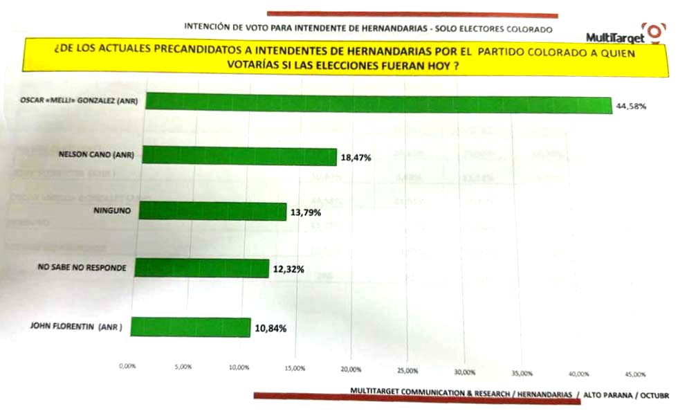 Ante la pregunta: «¿De los actuales precandidatos a intendente de Hernandarias por el Partido Colorado a quién votarías si las elecciones fueran hoy?», Óscar «Melli» González obtuvo un sólido 44,58% de las preferencias, distanciándose significativamente de sus competidores internos.