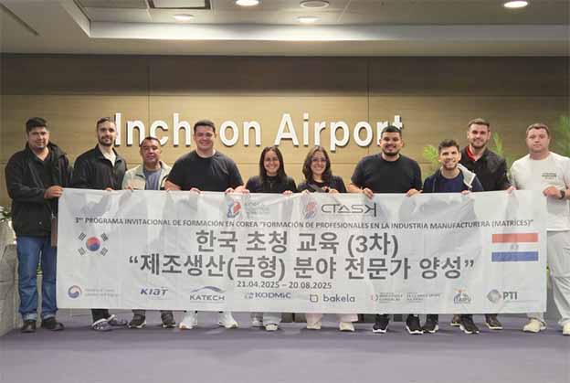 En el marco del “Convenio de Apoyo al Centro TASK Paraguay de Autopartes y Plan Piloto de Movilidad Eléctrica Sostenible”, la comitiva conformada por 10 técnicos paraguayos inició la capacitación en Corea del Sur. Se trata del tercer grupo de profesionales que recibirá la instrucción sobre matricería, movilidad eléctrica y manufactura en el país asiático.