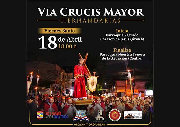 El punto de partida será la parroquia Sagrado Corazón de Jesús del Área 6, con la dramatización de 14 estaciones del Vía Crucis de la pasión y muerte de nuestro Señor Jesucristo. La procesión concluirá frente a la Parroquia Nuestra Señora de la Asunción, en la plaza central de la ciudad de Hernandarias.