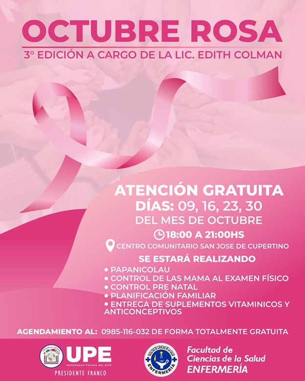 La Universidad Privada del Este (UPE), a través de la Facultad de Ciencias de la Salud, en su tercera edición, se une a la campaña Octubre Rosa, de lucha contra el cáncer de mama, ofreciendo atención médica gratuita en la institución.