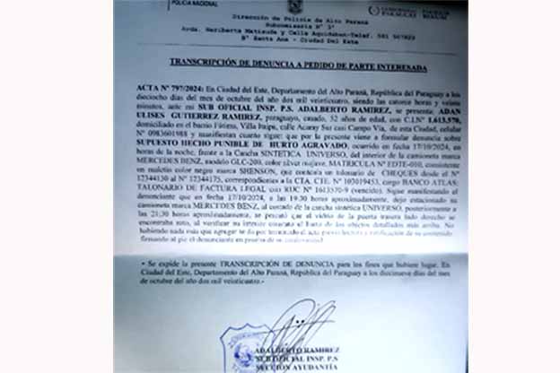 La víctima de la sustracción de los cheques, Adán Ulises Gutiérrez Ramírez, señaló que el talonario, con hojas en blanco, con cuenta corriente N° 103019453 del Banco Atlas, fue hurtado del interior de su vehículo el pasado 17 de octubre de 2024, en el estacionamiento de la cancha sintética Universo, de Ciudad del Este.
